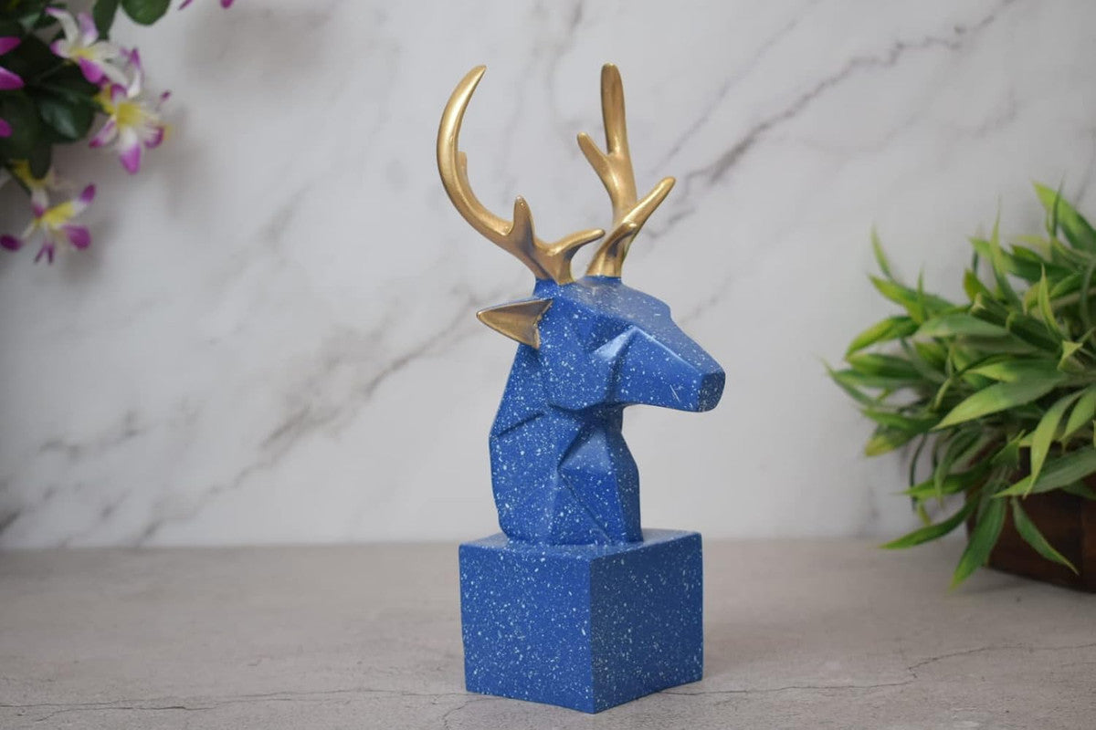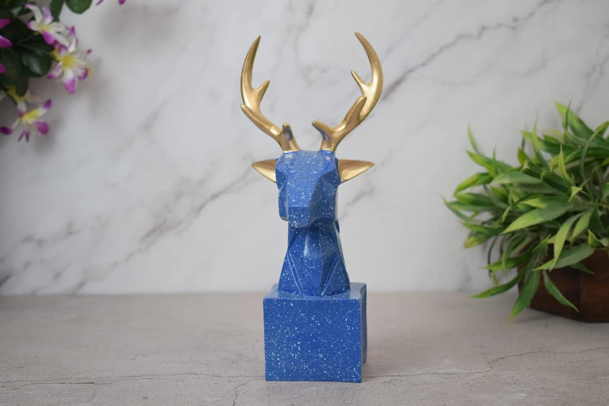 Unique Decorative Piece: Blue deer head sculpture with gold antlers adds a touch of elegance to any room