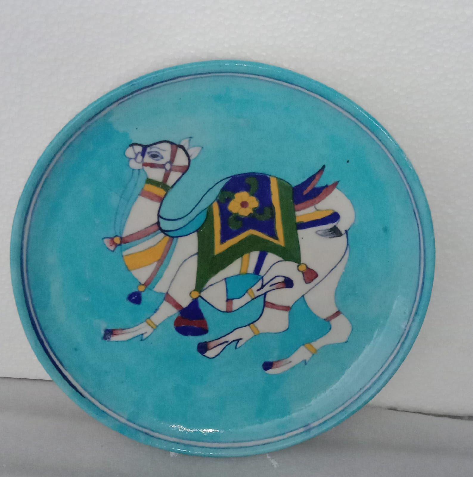 Add a touch of Rajasthan’s royal heritage to your home with this handcrafted 10-inch Blue Pottery plate. Featuring a beautifully hand-painted camel motif, this piece reflects the charm and artistry of Jaipur’s traditional craft.