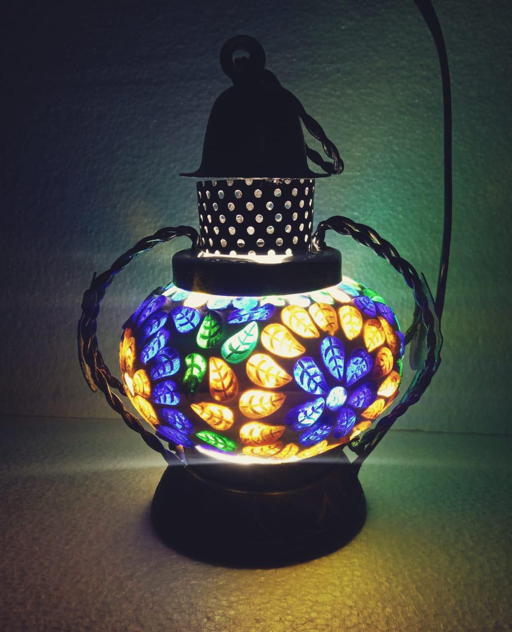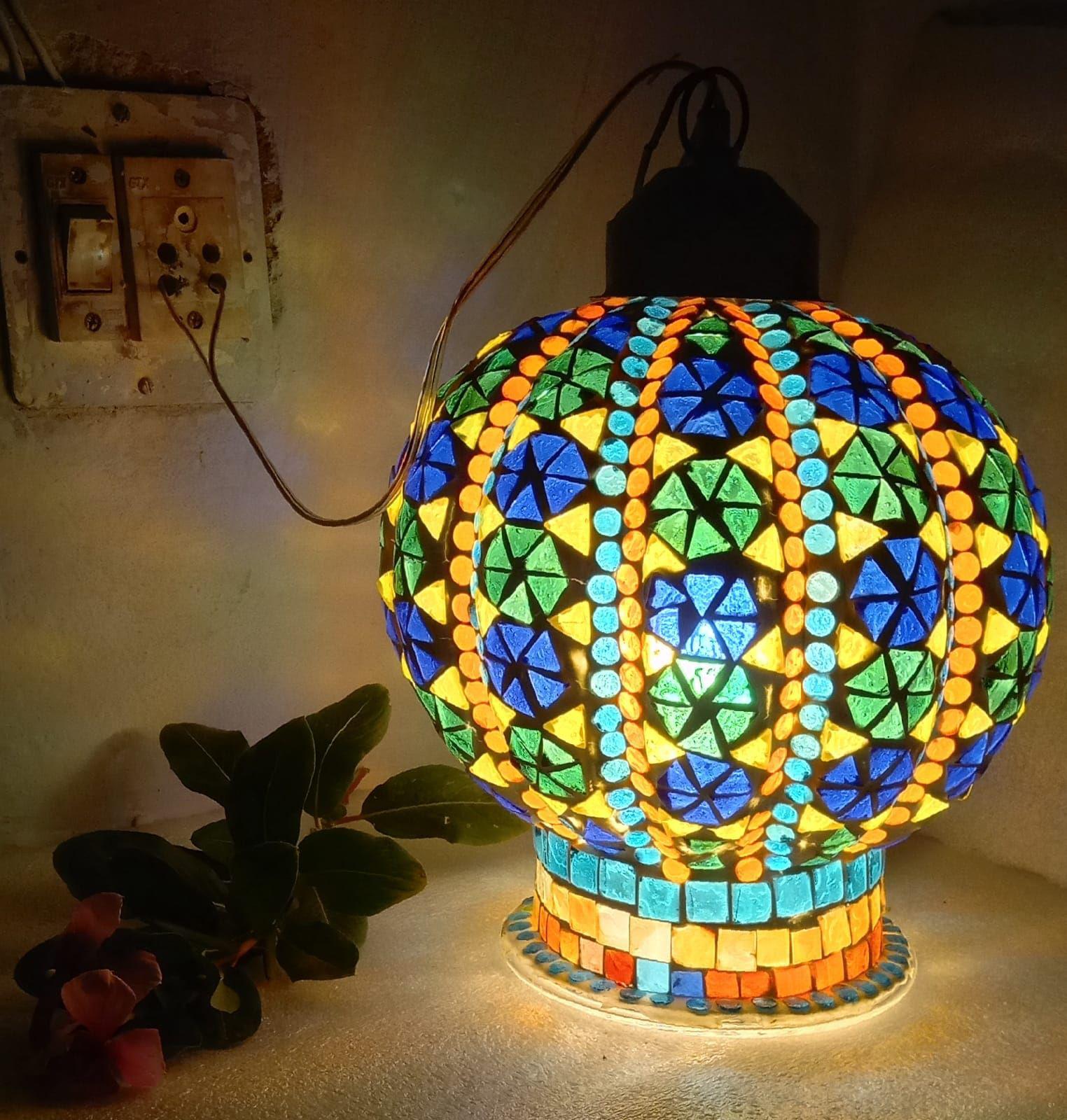 Bring warmth, colour, and artistry into your home with this stunning handcrafted mosaic lamp. Each piece is carefully designed with vibrant leaf patterns in shades of blue, green, orange, and yellow, creating a beautiful play of light and colour when illuminated.