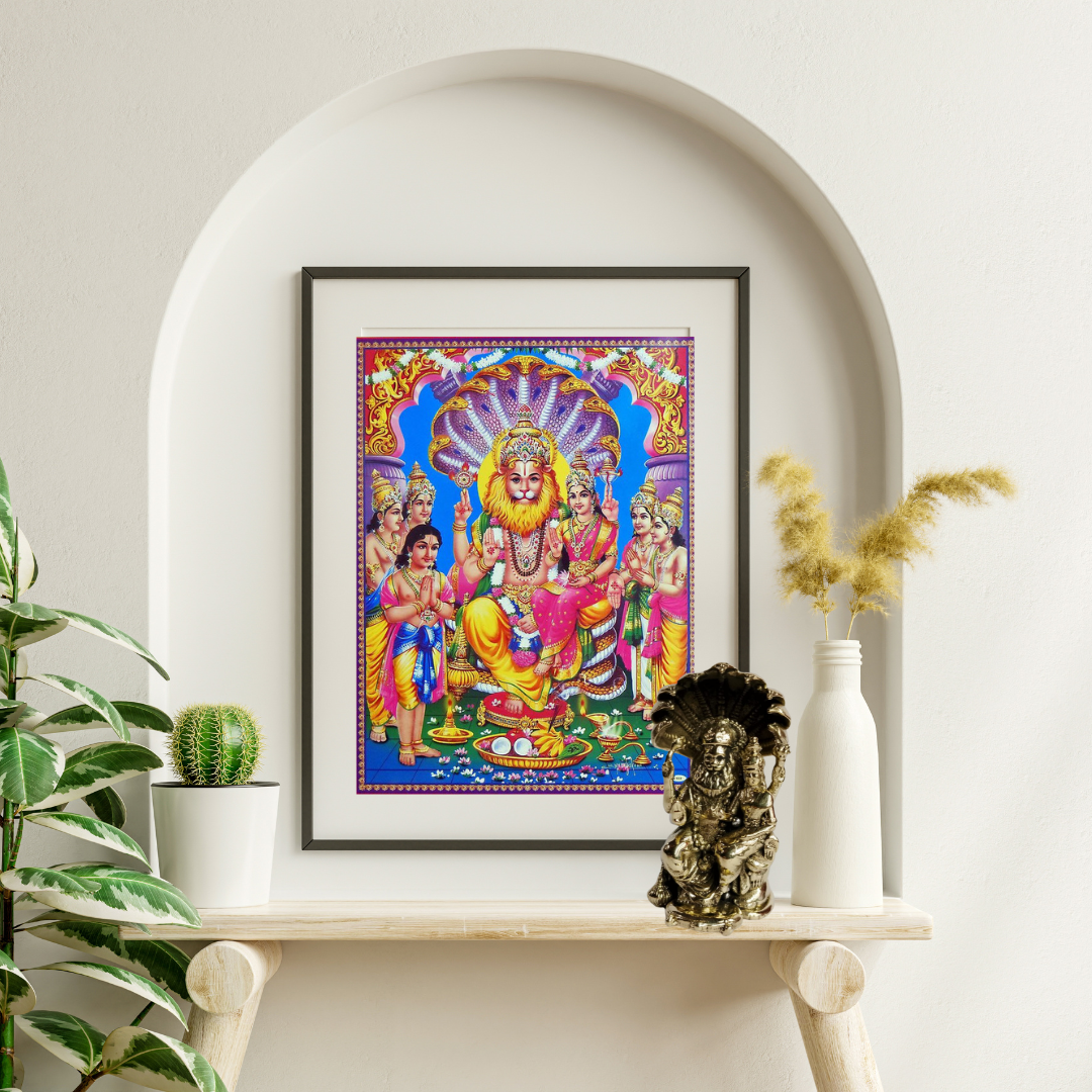 - š Divine Representation ā Features Lord Narasimha with Goddess Lakshmi under a five-headed Sheshnag canopy.